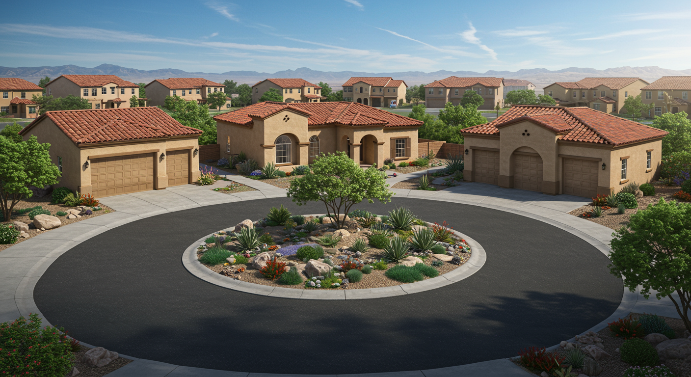 Landscaped Gardens: Low-maintenance desert landscaping with native plants, fire features, water fountains, and lush greenery creates a serene and visually striking escape.